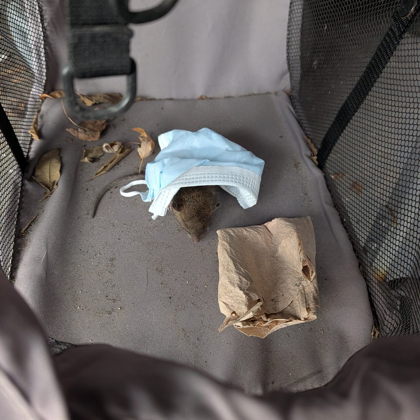 If this had been a fully grown rat, perhaps I would have paused, but it was a tiny thing, resembling one of the hamsters I had in my youth. I thought I could at least try to help it survive, so I picked it up and walked around the corner. Under someone’s back porch, covered in snow and leaves, was a stroller. I set the little rat down in the stroller, took some trash out of my pocket, and attempted to make it a nest. The little rat perked up when I placed it in the stroller. It moved slightly and looked at me with shiny little rat eyes.